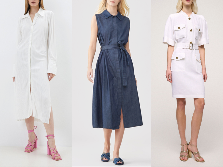 Это популярная среди модниц модель с застёжкой спереди немного модернизировалась за счёт добавления деталей и кроя: асимметричного низа, плиссировки, необычного воротничка. Женственно смотрятся модели миди, макси свободного силуэта с акцентом на талии. Также стоит обратить внимание на стиль сафари в бежево-коричневой гамме или белое платье-рубашку.