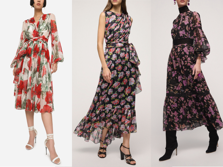В новом сезоне в моде платья и с крупным, и с мелким рисунком. Какой из них выбрать? Здесь нужно учитывать свои параметры – если фигура миниатюрная, тогда лучшим решением будет средний размер принта, а для коррекции объёмных форм стоит обратить внимание на мелкие цветы.