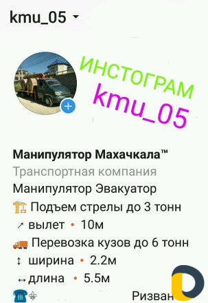 1500 р/час оплачивается не менее 2 часа работы МАНИПУЛЯТОР Перевозка груза до 5 тон по Махачкале Грузоподъемность кузова 5 тонн Грузоподъемность стрелы 3 тонн ПЕРЕВОЗКА: ЖБИ, кирпича, БИГБЕГ цемента, смесей, других стройматериалов, станков, оборудования. ВОЛДАЙ-ЭВАКУАТОР Длинна кузова 5, 8 метра Ширина кузова 2, 2 метра перевозка автомобилей, спец техники